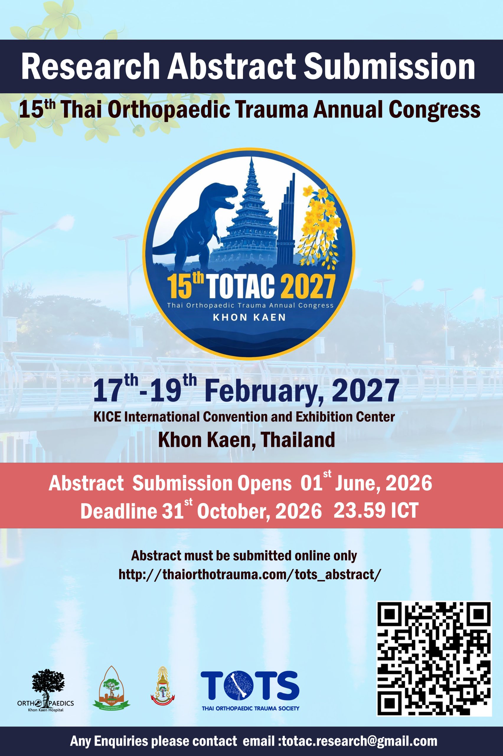 We are delighted to invite you to participate in the upcoming 15th Thai Orthopaedic Trauma Annual Conference (TOTAC 2027), Thailand’s most significant event for orthopaedic trauma specialists, which will be held in the historic and charming city of Khon Kaen.
